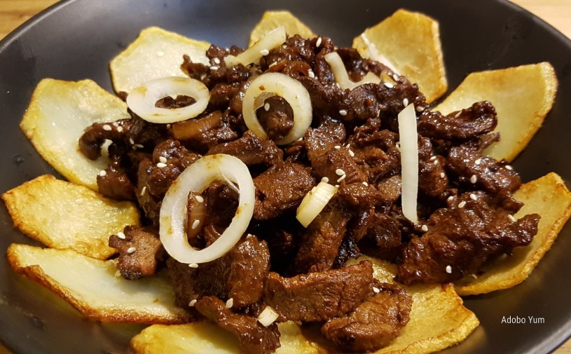 This is a filipino “beef steak”. This dish is easy, delicious and flavourful dish. A thinly sliced marinated beef that is so easy to cook. Kalamansi is the best souring agent for this but the use of lemon is also flavorful. Kalamansi is also known as calamondin or kumquat. For the beef, there is a thinly sliced available, but it to make it more tender you still have to use a meat tenderiser / tenderizer hammer.